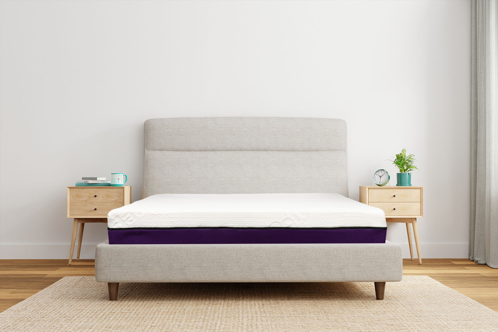 The Polysleep mattress has a simple two-tone look, with a white top cover and purple base joined by a black zipper. The cover is made from a blend of polyviscose, polyester, and spandex. It's breathable, water-resistant, and can be machine washed. However, it doesn't include any added cooling features. The Polysleep name is stitched into the top for a modern finish.