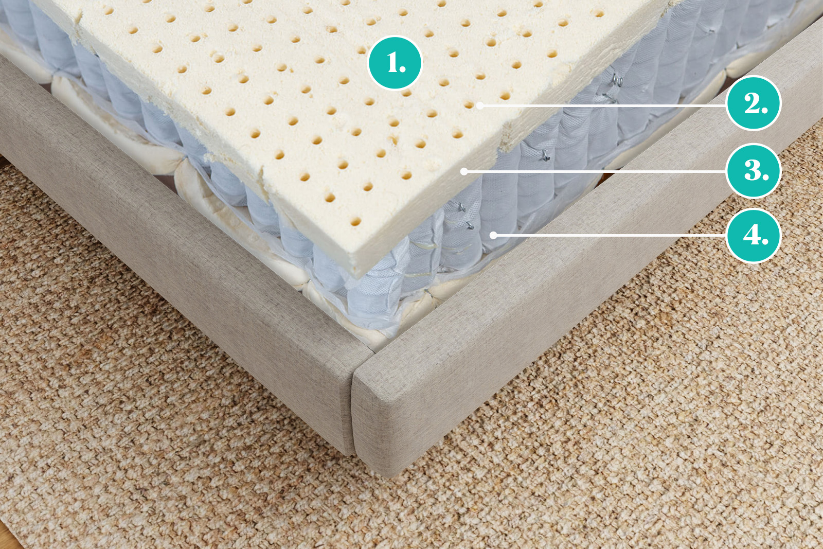 - 4th Layer: 1" of additional Dunlop latex helps support and cushion the coils on your bedframe.