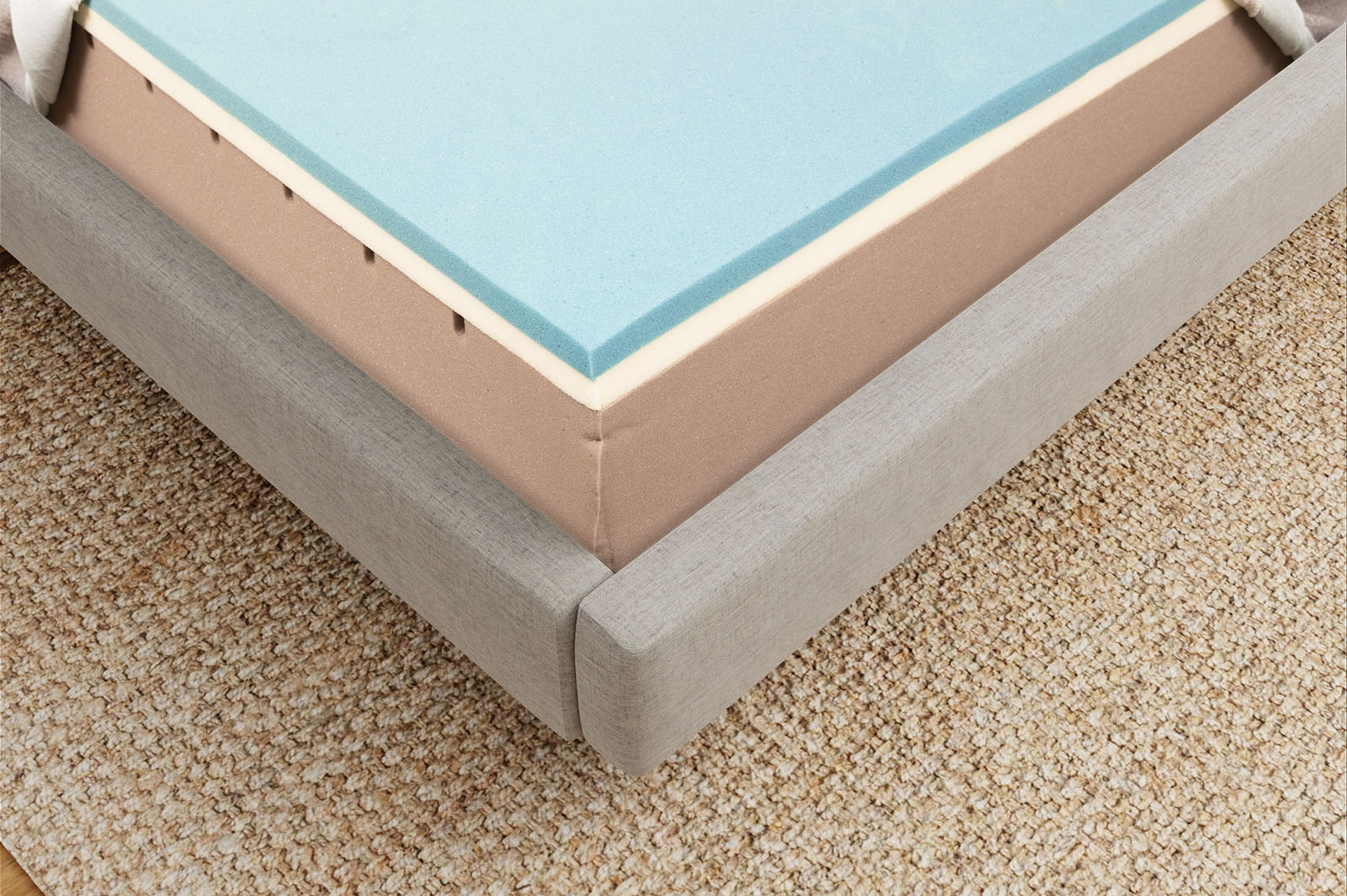 The Bloom Mist mattress cover is crafted from copper-infused organic cotton and features a clean, neutral look. The top part is removable and machine washable. Beneath the cover, a rayon-based protective sock helps to reduce fire risk.