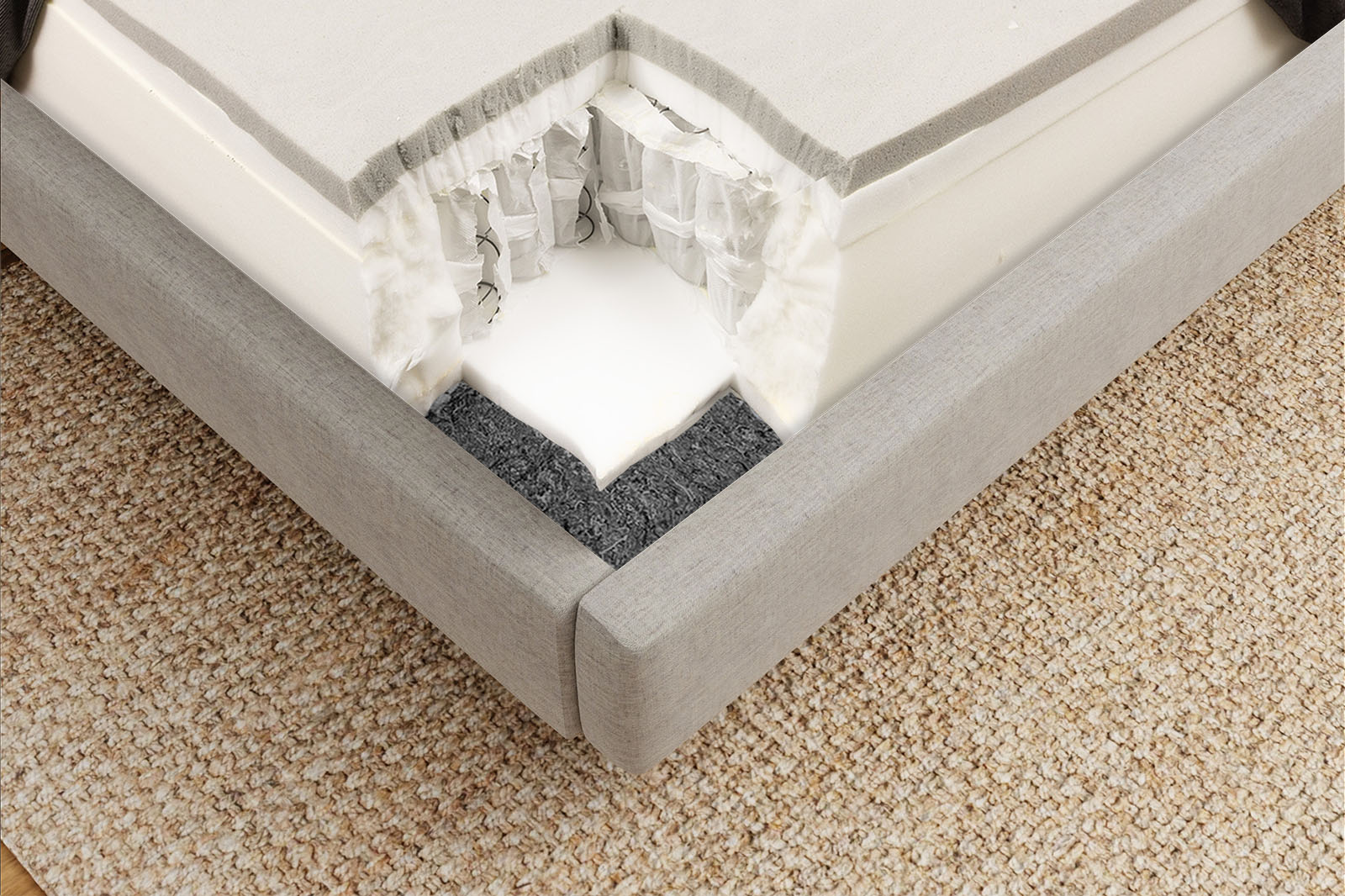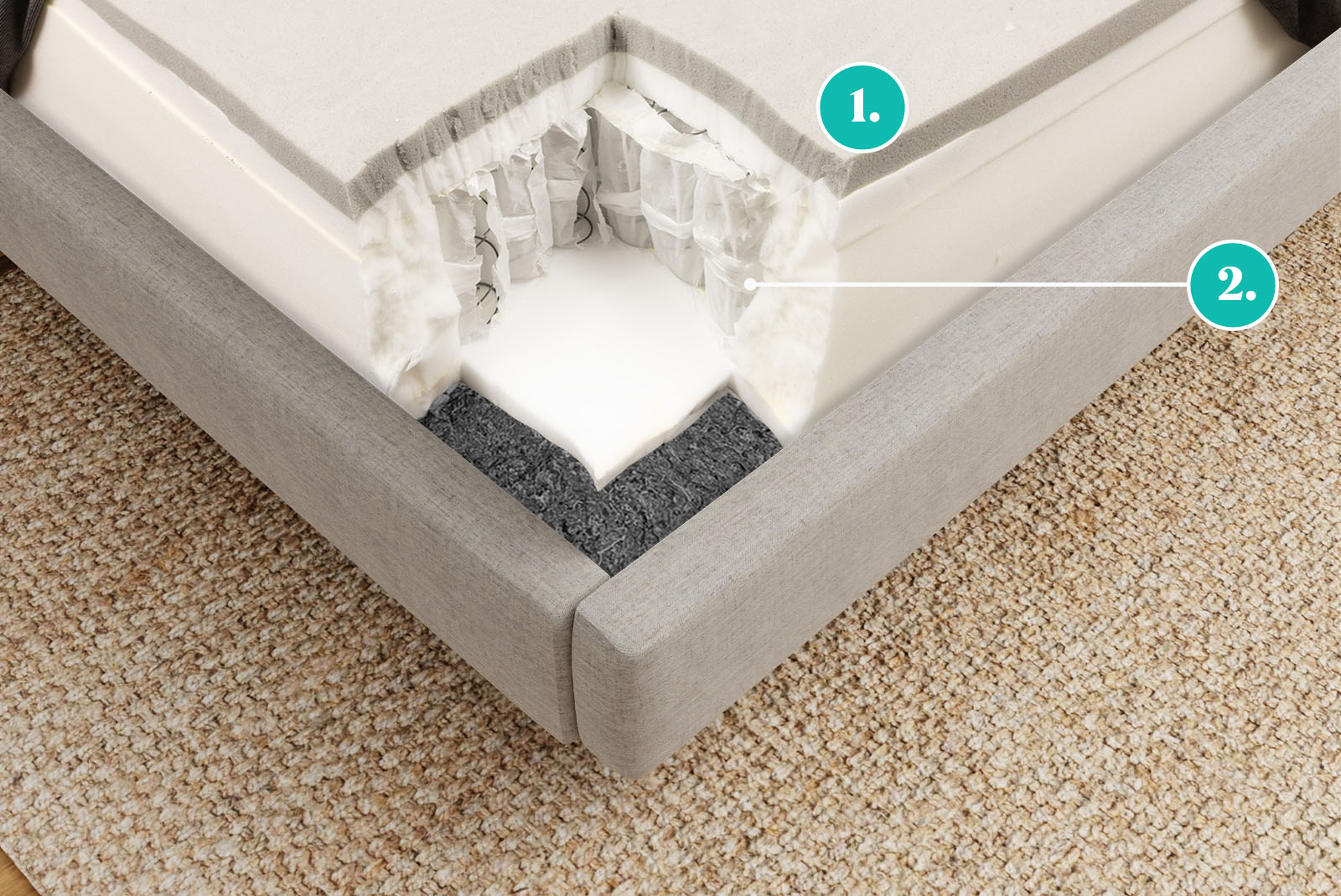 - 3rd Layer: 6″ pocketed coils with individually wrapped metal coils, reinforced with foam along the edge for support. These coils provide targeted support across the body, reduce motion transfer between partners, and improve stability around the perimeter of the mattress.