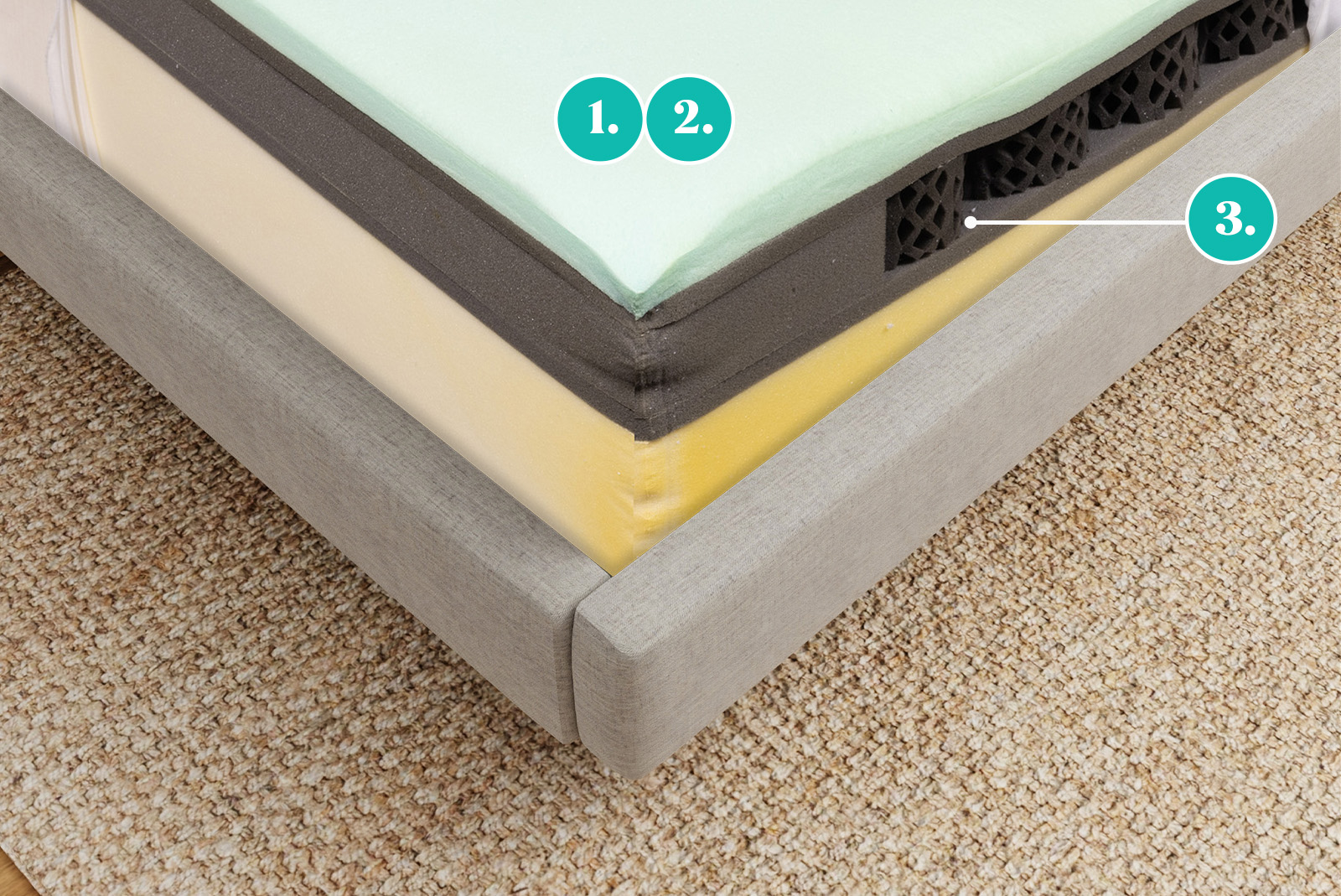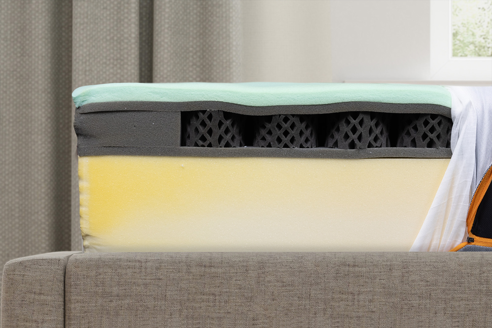 - 2nd Layer: 3″ of foam, made of 2" Octasprings sandwiched between 0.5″ foam sheets. These "springs" are designed to move in different directions to conform to your body and provide pressure-point relief.