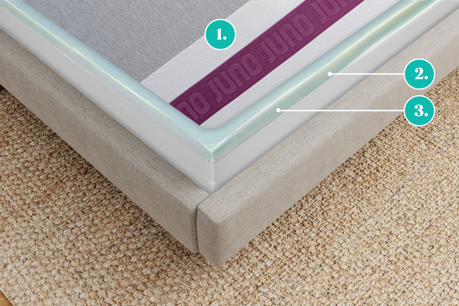 The Juno stands 8" tall and has 2 foam layers. It's advertised as medium-firm, which matches the results in third-party engineer testing we commissioned. Every foam layer used in the Juno mattress is made in Canada and is CertiPUR-US® certified.