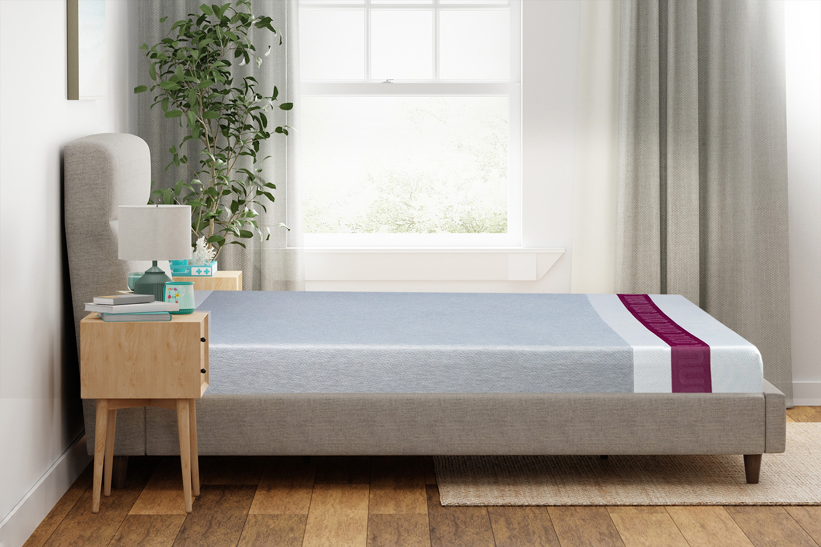 The Juno mattress cover takes its design cue from classic Canadian wool socks, with grey, white, and berry-coloured stripes. One end has a bold berry stripe that stands out. Because the cover isn't removable or machine washable, it's best to spot-clean it only.