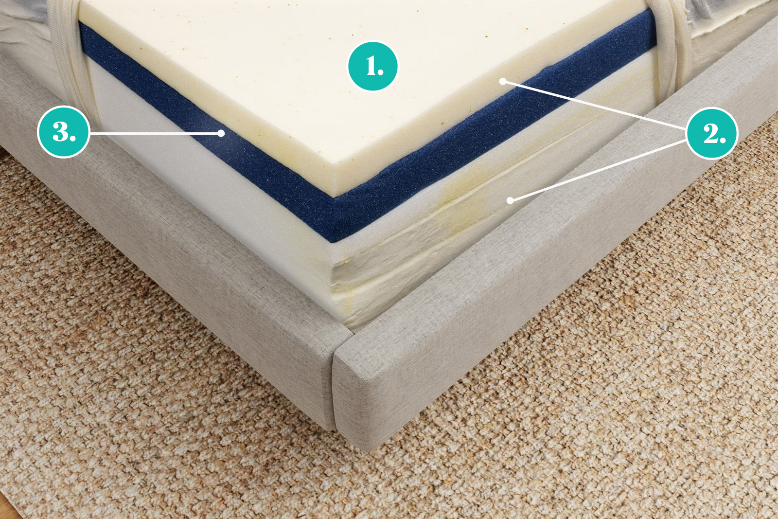 The Layla Memory Foam mattress is 10.5" tall and built with 4 foam layers. Its flippable design means you can choose between a soft side and a firm side, but both sides performed very similarly in third-party testing (commissioned by us).