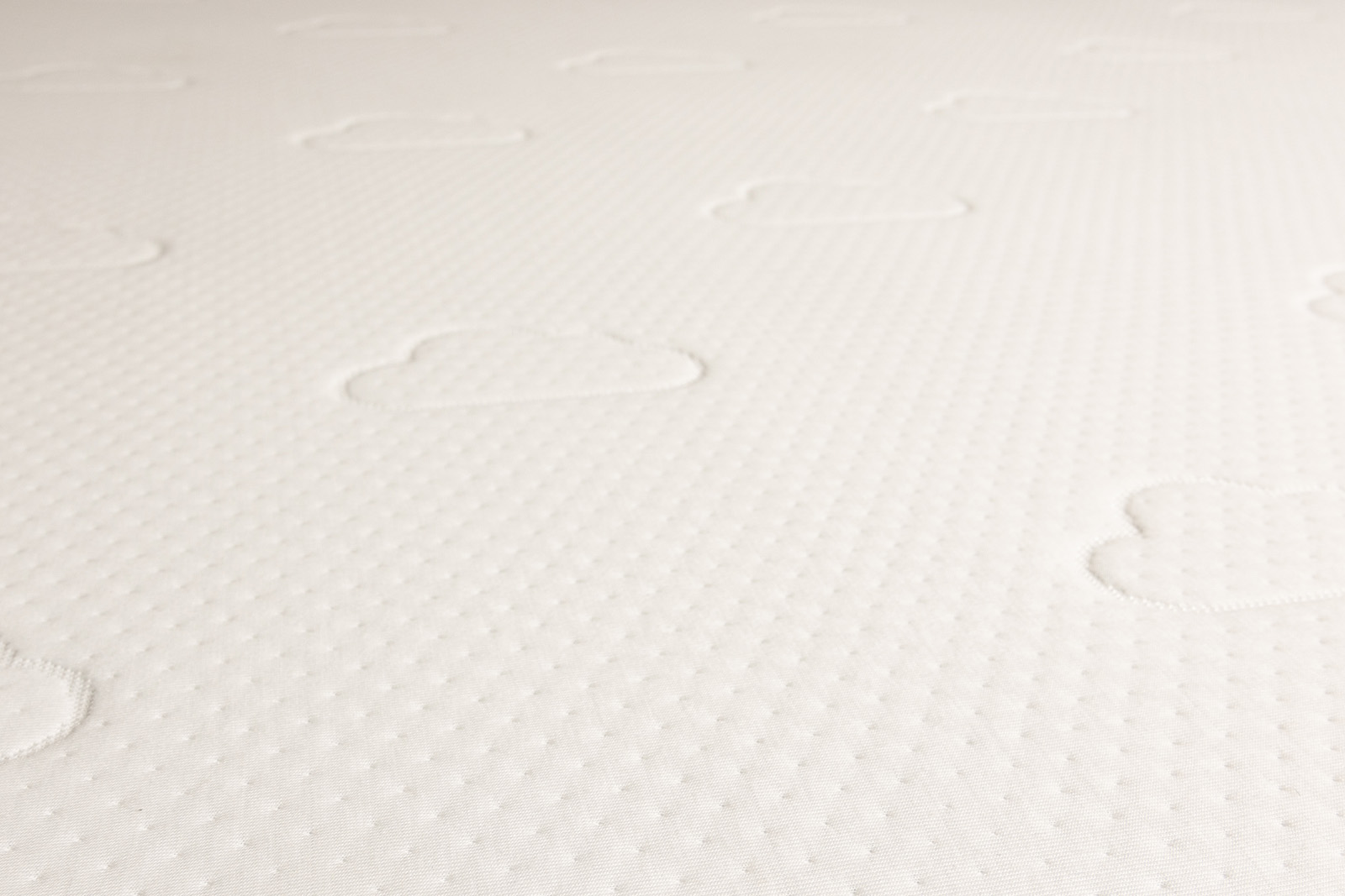 Puffy Cloud's cover has a white top and grey diamond-pattern sidewalls. The logo is stitched at the foot of the bed. The cover is made of polyester, which isn't known to be a very breathable fabric. That said, the cover is designed to be hypoallergenic and moisture-resistant, and it can be removed for machine washing.