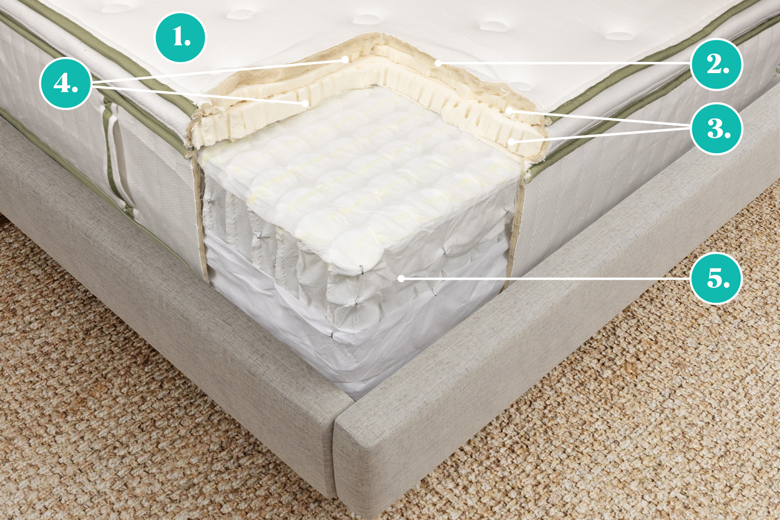 - 2nd Layer: 1" of perforated, natural Dunlop latex foam to circulate air and cool sleepers off. Latex is also a "springy" material, which adds a responsive feel to the mattress.