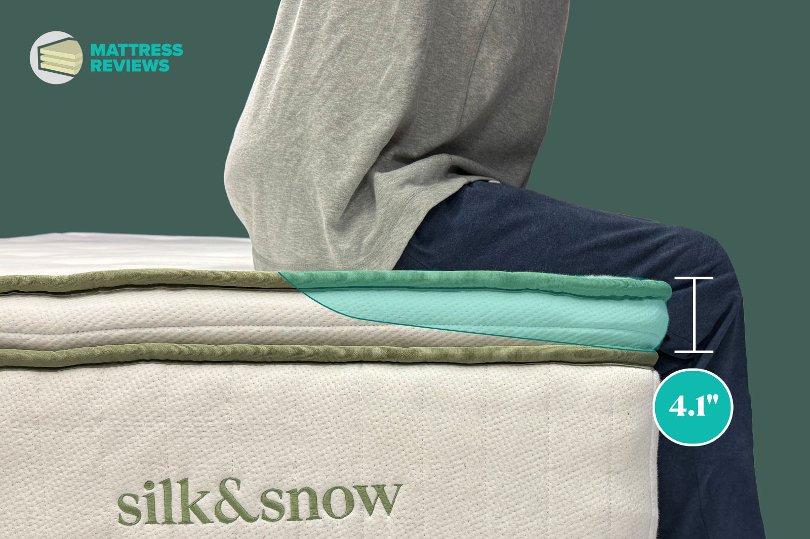 The Silk & Snow Organic is a hybrid mattress made with organic materials. It’s available in plush, medium-firm, and firm models. We cover the medium-firm version in this review, which is 12″ tall and has 3.8 internal layers. In third-party engineer testing (commissioned by us), it scored well for edge support and motion isolation.