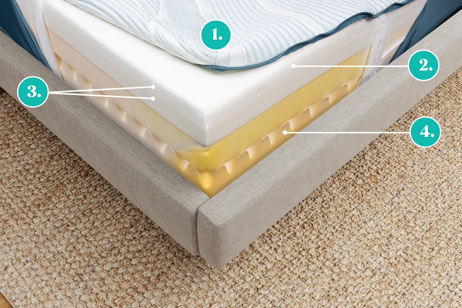 - 1st Layer: 1" of aerated TEMPUR® Material, which uses an open-cell design to retain less heat and promote greater airflow.